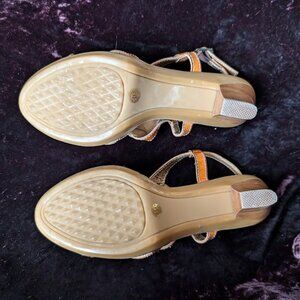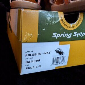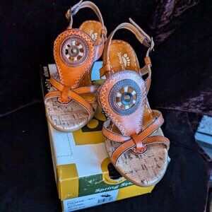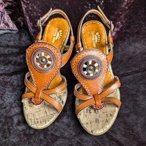 These AWESOME strappy, sexy, Spring Step Western Rodeo, high-heel, stack-heel sandals have pretty Medicine Wheel Medallions and are made of Leather & Cork with brass accents. They are LIKE NEW, worn once. Size 39 / 8.5 US. Two lovely shades of tan with embossed leather and white stitching. Height: 3-1/2" heels including a 1/2" cork foot bed. Hard synthetic soles with some grip and wooden stack heels, these new but slightly retro feeling (1970s style) western sandals are the bomb. Look great and have fun!