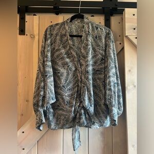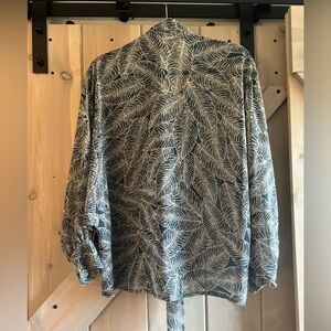Relaxed fit dolman sleeve with button cuffs. Semi sheer leaf print with knit tie front. Snap closure at center bust. Last photo for styling.