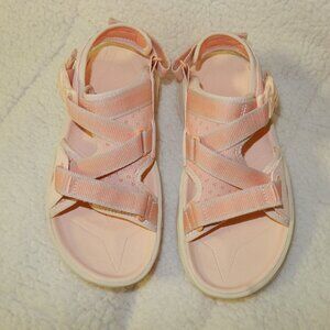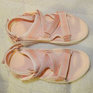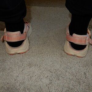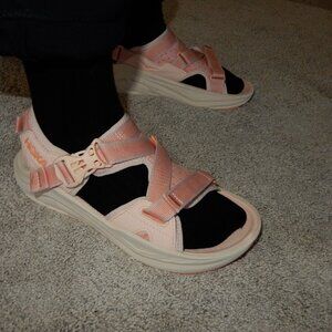 Peach colored sandals, worn 1x to grocery store and never again, I just wear my boots EVERYWHERE. Darkened photos show detail on sole, as you can see there is virtually no wear. My Mom was kind enough to model for me, so you can see what they look like on. Size 8 womens, B width but can fit a C. Multiple adjustment points for the perfect fit. If you're a socks and sandals person, these are a year round item. Retailed for $140. Had for less than a year, bought in March 2025.
