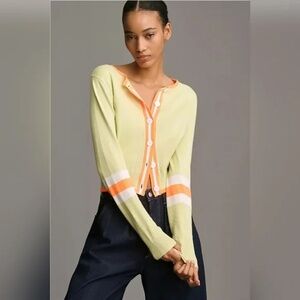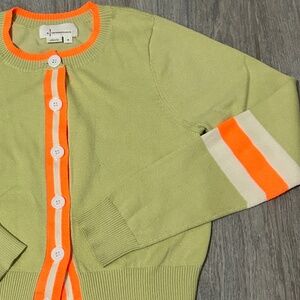 LIKE NEW - WORN ONCE IN EXCELLENT CONDITION! Women's Anthropologie lime green, orange and cream button down cardigan sweater. Great detailing, orange, cream stripes on sleeves. Crew neck, buttons down the front - great layered or alone. Measures 18" long from shoulder to bottom. Lightweight knit fabric blend. SIZE - MEDIUM
