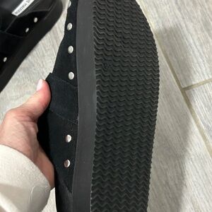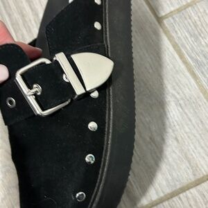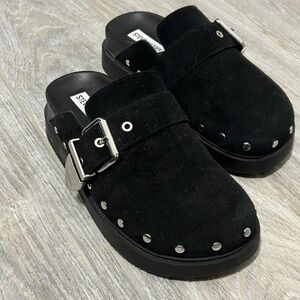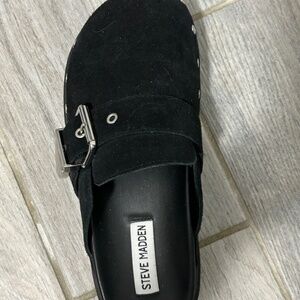 LIKE NEW - PURCHASED AND WORN TWICE IN GREAT CONDITION! Women's Steve Madden Cherrie slide in clog. Black suede with silver studs surrounding the top portion of the clog, with great looking silver buckle. Bottom has almost no wear as they were barely worn. Easy to care for, if you get any fuzz or lint from wearing, simply brush - great looking on, just ended up not using. SIZE - 6.5