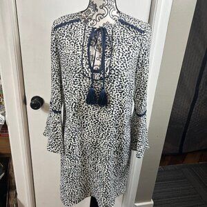 LIKELY Adair Crochet Trim Bell Sleeve Shift Dress in Confetti. Tassle ties at front. 100% polyester. Size small
