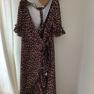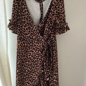 Charming minidress with leopard fabrication adds volume with ruffled hem, puff-style sleeves and gathered waist, cinched with a sashed self-tie. A great piece flattering to all body types with the universal wrap style.
