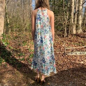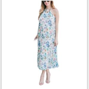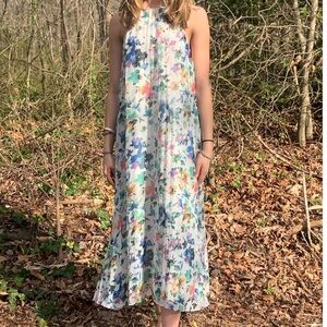 LIKELY Midi Dress 8 Chiffon Sheath Pleated Halter Floral Flowy Party Coquette