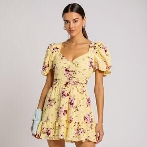 LIKELY Mini Dress in Snapdragon Floral (Yellow and Pink) from Revolve, perfect for garden parties or date nights! New with tags, featuring a sweetheart neckline, puff sleeves, ruffle hem, detachable waist tie, and hidden back zipper. Lightweight polyester with stretchy lining. Such a pretty dress. Sold out on Revolve.
