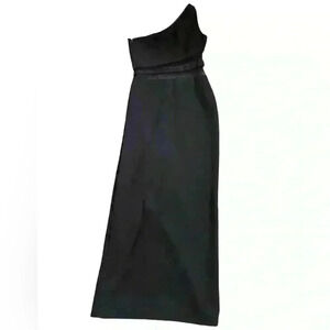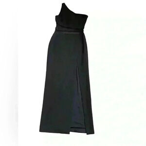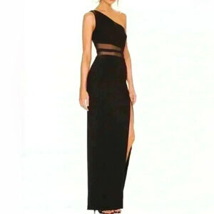 LIKELY Nolita Gown Fully lined. Hidden side zipper closure. One shoulder styling with non-slip silicone grip trim at neckline Mesh detail at waist. Side seam slit Midweight ponte fabric.