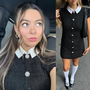 LIKELY | Riello Dress Black Tweed Collared Mini Shirt Dress Crystal Buttons 0