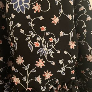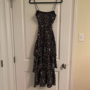 Ankle length Likely brand SOREL dress. 100% Polyester. Black base with blue/coral/white floral print. Fitted bodice and full ruffle skirt. Size 00.