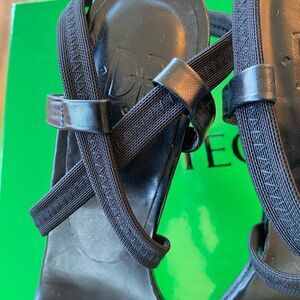 NEVER WORN Donald Pliner black strappy heel - size 9.5. Heel protection added. 3.5 inch heel.