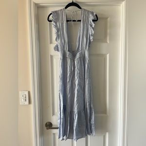 I forgot what brand the dress is, but is it from South Moon Under maybe 3 years ago, worn once. SUPER WRINKLY in the pictures (sorry I don’t own a steamer), but when the wrinkles are out it is a beautiful silk piece.