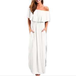 Soft and Stretchy, Off shoulder ruffle party dresses, Side-seam Pockets, Floor Length, Casual Dresses, Long Dresses, Maxi Dresses.