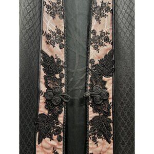 Intricately embroidered floral appliqué on a rose silk panel paired with ornate frog closures and sheer ruffle trim. A stunning collector's piece ideal for special events or theatrical layering.