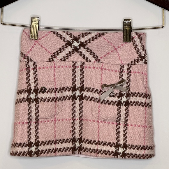 Adorable Lili Gaufrette Plaid Skirt in Pink/chocolate. Two front pocket details with velvet bow. Adjustable waistband to back. Wool/polyester mix with soft lining for comfort.