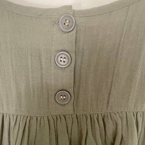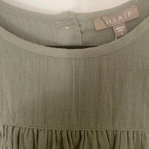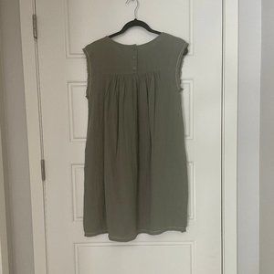 LILLA P CAP SLEEVE SHIFT DRESS ALOE SIZE S. THIS CAP SLEEVE DRESS IS AN EASY SHAPE AND IS THE PERFECT THROW-ON--AND-GO- STYLE!! AND OH SO COMFY. THE BUTTON CLOSURE AT THE BACK AND THE CONTRASTING STITCH AND SLIGHTLY FRAYED ARMS AND HEM ADD AN EXTRA TOUCH OF DETAIL..