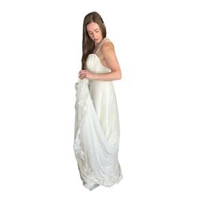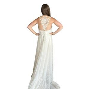 Stunning boho lace wedding gown from Lillian West. Care/content and size tag has been removed. I would say it is closest to a 10, but could use some alterations to make it perfect fit. The top elastic has popped as shown, but the other ones work and zip. Some minor wear on the hem as shown, overall great used condition.