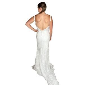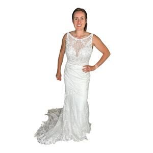 Allover Lace Dress with Sabrina Neckline and Detachable Sleeves 66191. Gorgeous lace boho mermaid wedding gown from Lillian West. There's no size tag or care tag. Please refer to measurements below. Mannequin is a 6 for reference. One of the snaps for the removable sleeves has come off, otherwise excellent like new condition.