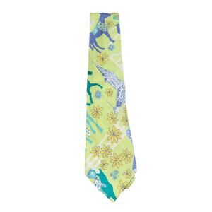 The Lilly Pulitzer 100% cotton pastel yellow floral horses tie is a designer accessory for men featuring a classic length of 3.5x56 inches. The tie showcases a vibrant multicolor floral pattern with a unique horse theme, perfect for adding a touch of style to any outfit. Made from high-quality cotton, this tie is a versatile and fashionable choice for those looking to elevate their look with a pop of color and personality.