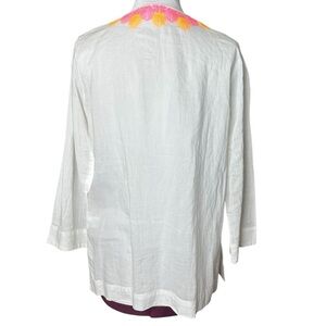 Colorful tunic top with bright pink and orange embroidered shell pattern
