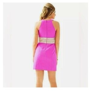 The Lilly Pulitzer Ashlyn Shift Dress in Size 2 is a vibrant and preppy piece perfect for various occasions, including travel, parties, and casual outings. The dress features a sleeveless design, solid pink color with gold embellishments, and a short length, making it ideal for summer, fall, and spring seasons. Made of cotton, this dress exudes a beachy, colorful, and classic theme, showcasing the signature style of Lilly Pulitzer.