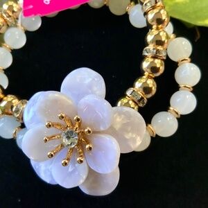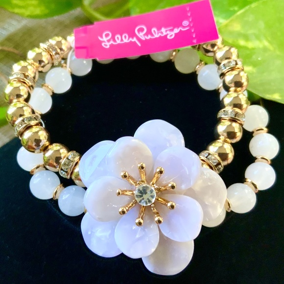 LILLY PULITZER BRACELET 🩷FLOWER BLOOM WHITE/GOLD /CRYSTAL 🩷BEADED STRETCH