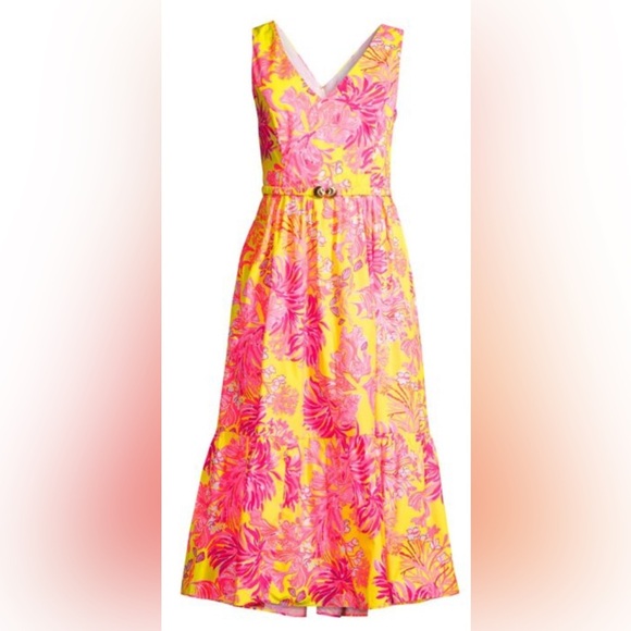 LILLY PULITZER Bri V Neck calla yellow floral coral Midi Dress. Size 2 NWT