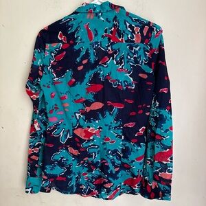 Stylish button down with abstract blue and red design. Perfect for adding flair to any outfit.