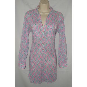 This is size medium and made by Lilly Pulitzer. It is made with 100% cotton and machine washable. It measures 20" across at the bust and it is approximately 33" in length from the seam at the back of the neck. This shirt buttons partially down the front, has two breast pockets and has tabs on the sleeves so they can be rolled up if desired. It is very gently worn, in excellent to like new condition, no rips or stains, will have some wrinkling with shipping. Very nice.