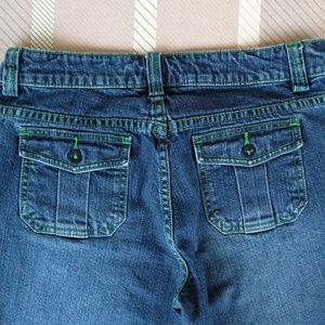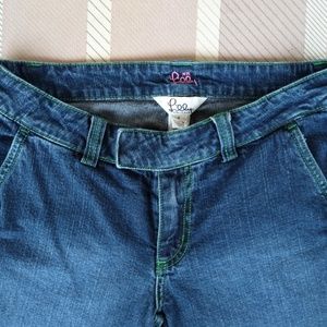 These Lilly Pulitzer jeans are cropped, with slits in the cuffs. Green stitching has been used on all seams above the hips. The back pockets have flaps W/ buttons. Label says they are size 0. Approximate measurements are; Waist: 29 in. / Inseam: 23 in. / Rise: 8 in. / Hips: 19 in. / knees: 10 in. / Cuffs: 10 1/2 in. They are made of 99% cotton & 1% Spandex. It has a double closure in front. They are in excellent used condition. Make me an OFFER !!
