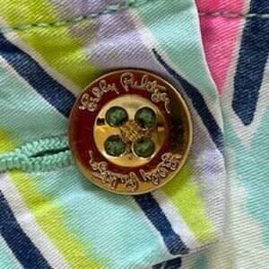 Lilly Pulitzer Callahan shorts featuring a vibrant, multi-colored print. These shorts are characterized by a low-rise and a 5-inch inseam, typical of the Callahan style. The print includes a mix of navy, pink, light blue, and lime green in an abstract, possibly tropical-inspired pattern. The shorts have a classic button and zip fly closure, with a gold-tone button at the waistband, and front slant pockets, along with back welt pockets. Lilly Pulitzer is known for its bright, colorful patterns, and these shorts are a good example of the brand's aesthetic. The Callahan style is a popular and timeless design, often available in various prints and fabrics.