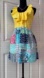 The bodice shines in a radiant yellow hue, featuring a flattering ruffled V-neck that adds softness and movement to the silhouette.