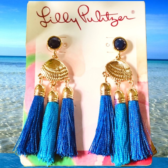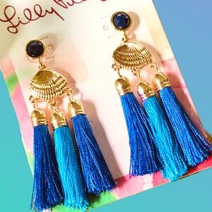 LILLY PULITZER EARRINGS NWT SEASIDE TASSEL ⭐️Capri Blue/Gold SHELLS-PIERCED-POST