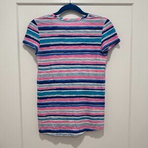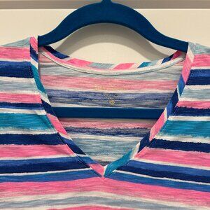 LILLY PULITZER Etta V-neck short-sleeved tee with painterly stripes; stripes are pink, white, and various shades of blue (light blue, navy blue, turquoise, etc.) Hem is a bit longer in the back. Very beachy, summer vibes. Excellent pre-loved condition.