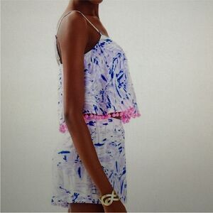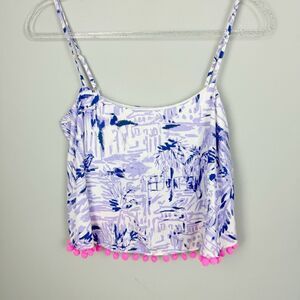 Adorable purple and white printed cropped tank top by Lilly Pulitzer. Thin adjustable straps. Hot pink Pom Pom trim. Built in shelf bra. Great condition. Women’s size 2.