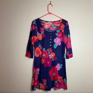Lilly Pulitzer Caila dress in Garden Games. Purple floral print. 3/4 sleeves. T-shirt dress. Henley neckline. Spring, summer, cruise, vacation, night out, date night, beach.