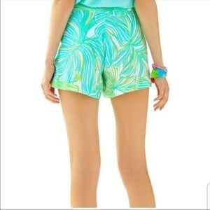 LILLY PULITZER Jeannie Green Sheen Floral Plant Print Lightweight Shorts. Front slant pockets. Side button and zipper closure. Banded waistband. 100% Rayon. Hand wash.