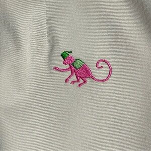 This Lilly Pulitzer Khaki Skort in Size 2 features a playful Pink Monkey embroidery with a Green Hat and Vest detail on the scalloped hem. Made from a blend of 75% Cotton, 22% Polyester, and 3% Spandex, this stretchy skort is perfect for casual occasions during the summer and spring seasons. The khaki skirt with pink monkey accents and zipper closure adds a fun and stylish touch to any woman's wardrobe, making it a versatile and fashionable choice for everyday wear.