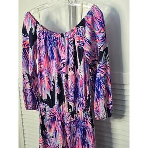 Elevate your beach style with this adorable Lilly Pulitzer Lana romper! Featuring a vibrant 'Bright Navy Palms Up' print, this off-the-shoulder design is perfect for a fun day out.