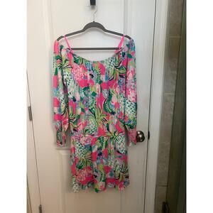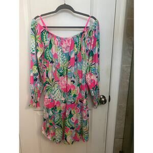 LILLY PULITZER Lana Skort Romper In Multi Raise The Bar M Beachy Party Hawaiian Off-the-shoulder romper with skirted bottom and smocked sleeve. Some colors are more vibrant in person. 3" Inseam. Rayon Spandex Jersey (94% Rayon, 6% Spandex). Machine wash cold, separately, delicate cycle. Imported.