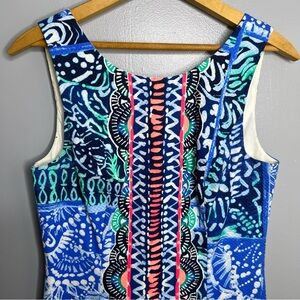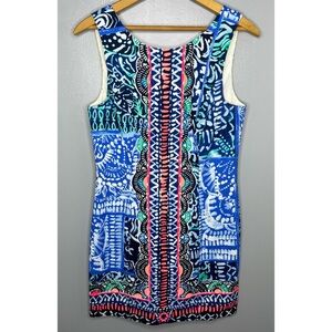 Lilly Pulitzer Multicolor Blue Mila Sleeveless Shift Dress. Sand dollar gold zipper on the back. Excellent Condition besides some self tanner staining on the inside but it’s not visible when wearing and it may come out when treated and washed! Fully Lined. Size 2. Bust-16” Length-33”