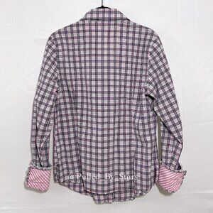 This long-sleeve Lilly shirt is a wonderfully colorful plaid in pink, green, blue, and white. The interior of the collar and underside of the sleeve cuffs (aka when rolled) have a nifty contrasting pattern of pink stripes. Features include a classic collared neckline with front placket and buttoned cuffs. Darted bust. Ruffled trim runs along the placket and cuffs.