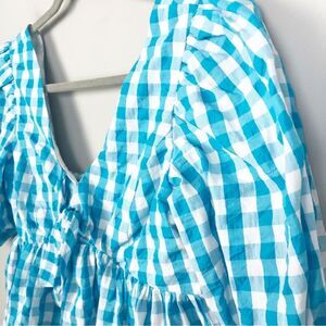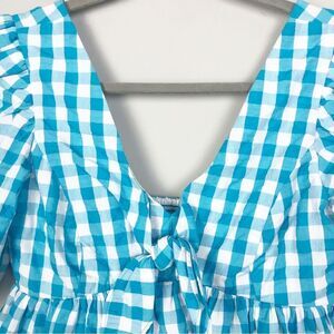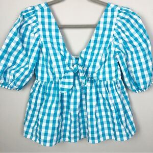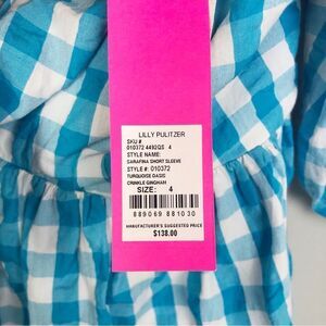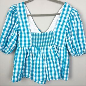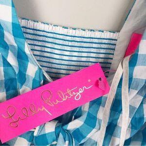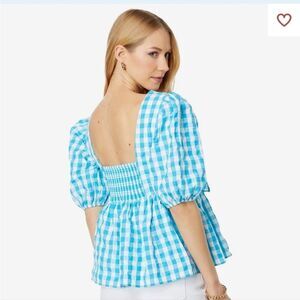 Adorable white and turquoise gingham plaid top by Lilly Pulitzer. Short puff sleeve. Tie front. Smocked back. Fit and flare style. V-neck. Brand NWT. Womens size 4.