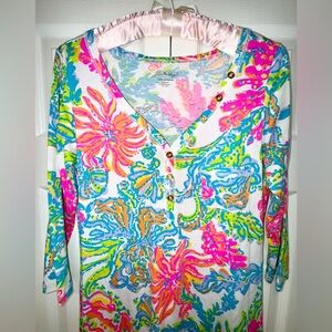 Palmetto dress features the vibrant Casa Marina print with a flattering V-neckline and gold button detail. Lightweight and comfy with 3/4 sleeves, perfect for vacations, resort wear, or casual outings.
