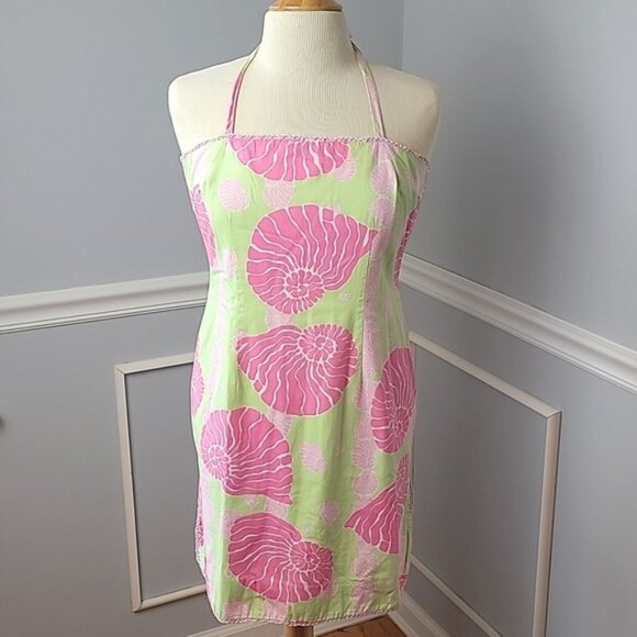 VINTAGE LILLY PULITZER Pink Nautilus Shell Print Strapless Halter Cotton Sheath Dress