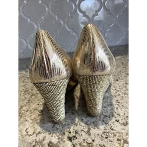 LILLY PULITZER SZ 7 1/2 RESORT CHIC GOLD LEATHER SLIP ON PEEP TOE WEDGES