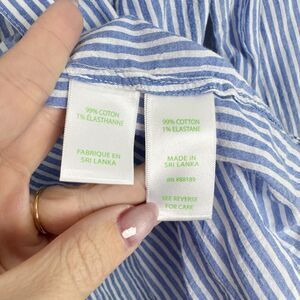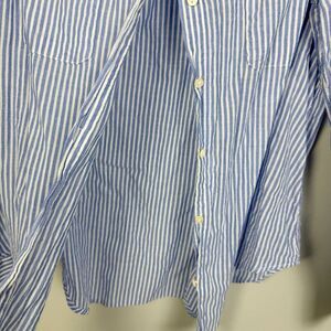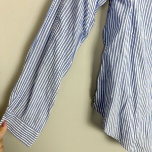 Cute, lightweight button up shirt by Lilly Pulitzer. Long sleeves. Blue and white stripe print. Sea View style in Coastal Blue. Good preowned condition - one small mark on the back of the collar as shown. Women’s size medium.