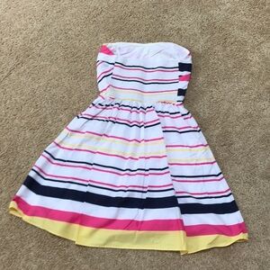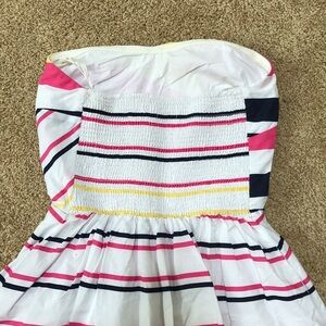 Lilly Pulitzer Size 2 white multi striped strapless dress. Smocked elasticized waist at back. Pleated from waist below. Fully lined and has pockets. Gently used