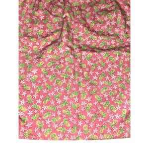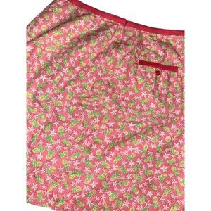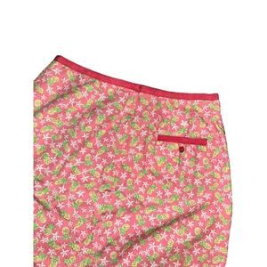 Embrace the playful beach vibes with this Lilly Pulitzer skirt featuring a cute pineapple and starfish pattern. The high-rise, knee-length skirt is made of comfortable cotton knit fabric with a zipper closure and lined pockets for added convenience. The vintage white label adds a touch of nostalgia to this fun and casual skirt, perfect for any occasion.