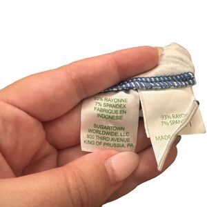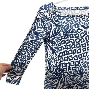 Blue tropical patterned mini dress. Gold buttoned details on shoulders. 3/4 sleeves. Boat neck. Has UV protection built in! Rayon, spandex blend. Great preloved condition, size XS