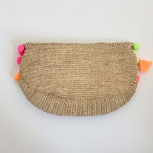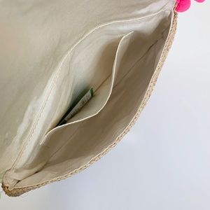 Lilly Pulitzer straw clam shell clutch. Alternating tassel and pom pom details. Natural raffia straw. Measures approx. 11 3/4”W x 6 3/4”H x 1 1/2”D. Brand new, never used and in perfect “like new” condition.