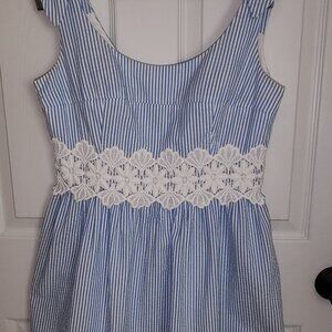 LILLY PULITZER TESSA DRESS SEERSUCKER STRIPE BLUE-WHT-LACE TRIM-TIE STRAPS SZ 6